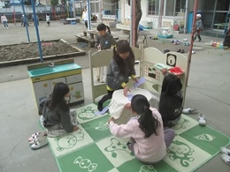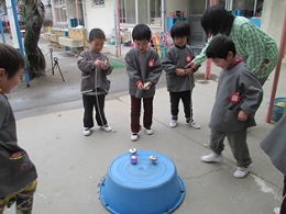 職員室前のコリントゲームは人気の遊び場です。何人かが集まってビー玉を弾いて遊んでいます。保育室では、今まで遊びの中で作った食べ物を全部並べて、ケーキ屋さんをやる姿もありました。
