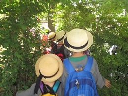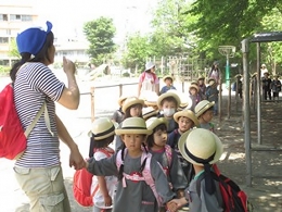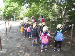 もうすぐ園外保育や遠足があります。そこでうさぎ組のみんなに、リュックサックやレジャーシートの扱い方、外でのお弁当の食べ方、そして「並んで歩く」ということがどういうことか・・・などを練習する機会を二日間設けました。並んで歩く練習は、第一小学校の校庭をお借りしました。おかげでちょっとしたピクニック気分が味わえたのではないでしょうか?