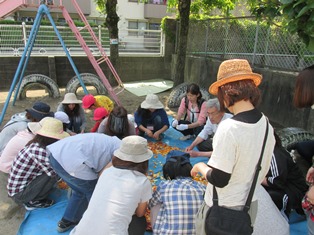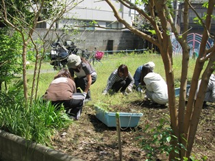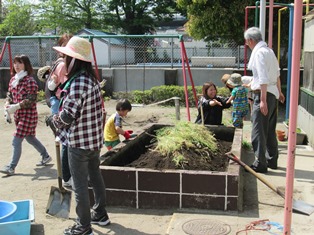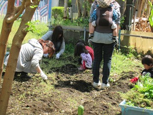 今年初の試みで、保護者の皆さんに「畑スタッフ」を募り、幼稚園の花壇や畑の世話を手伝っていただくことになりました。畑の草取りや野菜くずを使った土作りを行いました。