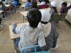 1年生との交流では、小学校入学を間近にした5歳児に、授業風景を見せていただいたり、ランドセルを背負わせてもらったりしました。
