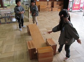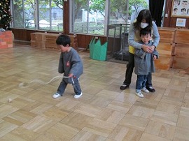 うさぎ組では木芯ゴマが回せるようになっている子が徐々に増えているようです。らいおん組は鉄芯ゴマに取り組んでいます。回せるようになっている子は、積み木などを使ってコースを作り、その上でコマを回す・・・ということに挑戦していました。
