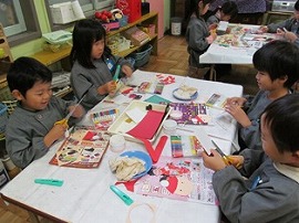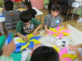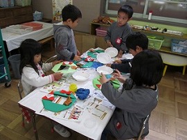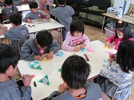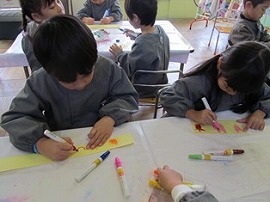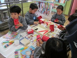12月1月生まれの誕生会がありました。らいおん組は司会とプレゼント作りの役目がありました。プレゼントは、透明フィルムの筒を飛ばして袋に入れるというおもちゃを作りました。司会は、友達とどんな言葉を言うか話し合って決めていました。