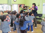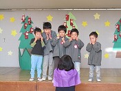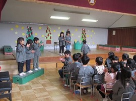 12月1月の誕生会で見せるプレゼントとして、劇を行いました。保育室で担任の先生との掛け合いを楽しみながら、だんだん劇の形にしていきました。