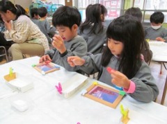 修了式の時のホールの壁面作りやおうちの人へのプレゼント作りに取り組みました。