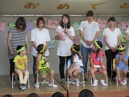 お誕生日のおともだちとお母さんへのインタビューです。子どもたちには、好きな動物を教えてもらいました。お母さん方には、今年度通して、誕生児のお友達の小さかった頃の気に入っていたものを紹介してもらいます。お人形や絵本、車など、実物を見せながら思い出を語っていただきました。