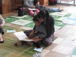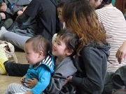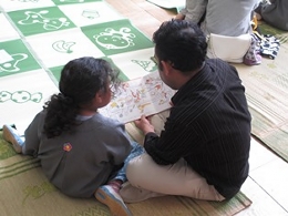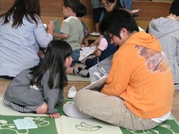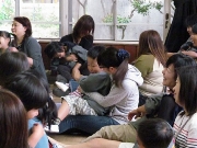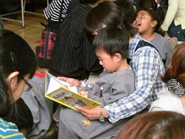 お話大好き! 全部の遊びのコーナーを回ったあとは、ホールで本を見る時間でした。本をおうちの人に読んでもらうという貴重な時間を過ごしました。読んでもらっている時の子どもたちの顔がとても素敵でしたよ!