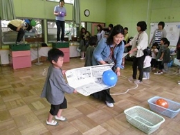 ナイスキャッチ! (高いところから落ちてくる風船を親子で協力して布や新聞紙等でキャッチしました。)