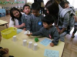 み~つけた! (カップに毛糸の玉を入れいくつかのカップに紛れさせてどれに玉が入っているかを当てるゲームでした)