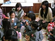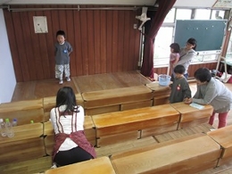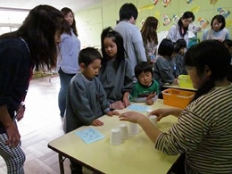 触れ合い遊びのあとには、らいおん組とうさぎ組のペアで遊びのコーナーを回りました。(これまでも、このペアでらいおん組がうさぎ組のお世話をする機会が何回かあったので、顔見知りになっていました。)今回の保育参加で用意した遊びのコーナーは4箇所でした。