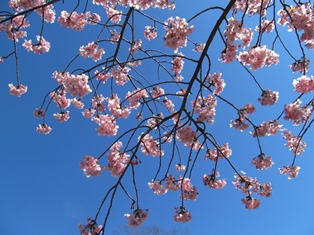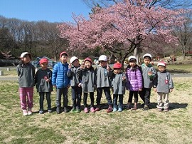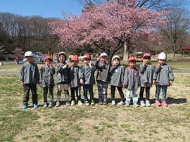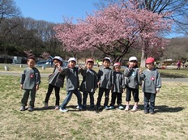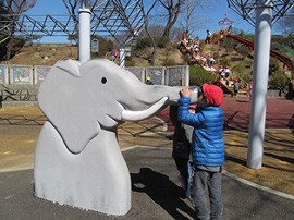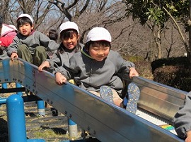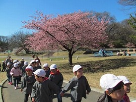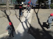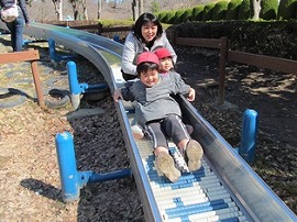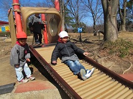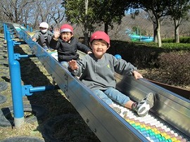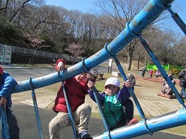 広場には河津桜が咲いていました。はじめの遊び場は、「ありじごく」というすり鉢状の滑り台と長い長いローラー滑り台でした。