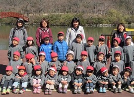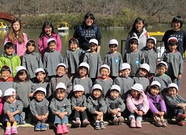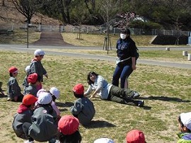 荷物を置いた広場に戻り、お弁当をの前にひと遊び。らいおん組とうさぎ組のいつものペアで、触れ合い遊びをしました。