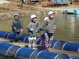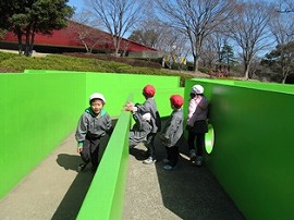お弁当後は広場の一角にある遊具で楽しみました。大きな迷路で走り回る子もいました。壁をよじ登る遊具もあり、何人かの子が挑戦していました。