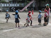 戸外ではフープを回す遊びが盛んです。らいおん組がリレーで使っていたリングバトンを握ってUターンリレーを楽しむ姿も見られました。