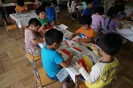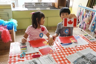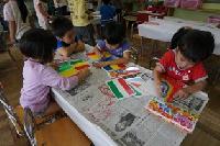 運動会に向けて、万国旗を描きました。しっかり色を塗って素敵な旗に仕上げていましたね!