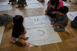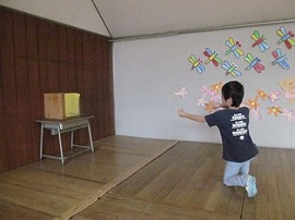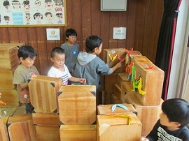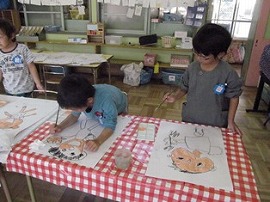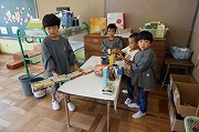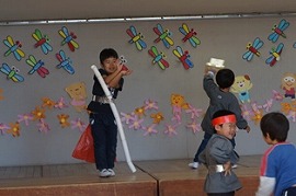 ホールでは積み木を使って、昆虫館を作っていました。お客さんにうさぎ組の子どもたちを招いて案内していました。また、弓矢を手作りした子が的を作って当てる遊びに熱中していました。