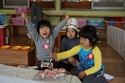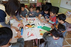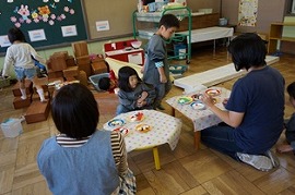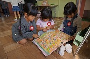 おうちごっこをしたり遊びに使うものを空き箱で作ったり、一緒に絵本を見たりなど、友達と一緒に何かをすることを楽しんでいる姿があちらこちらで見られました。