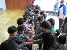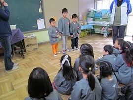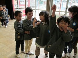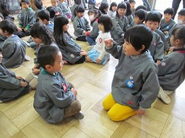 ジャンケン列車のゲームをしました。必ずうさぎ組とらいおん組の組み合わせてジャンケンをしました。一年間ペアで活動してきた相手と偶然に組むと、一段と嬉しそうな笑顔になっていました。