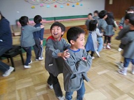 ふれあい遊びで「なべなべそこぬけ」をしました。何組かうまくひっくり返れず、手がこんがらかってしまうペアもありました!