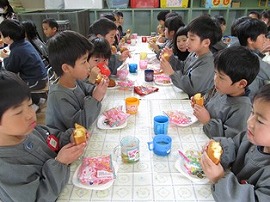 お別れ会の1部は楽しく遊び2部は一緒におやつをいただきました。一年間ペアで活動したお友達と隣同士で楽しく食べました。