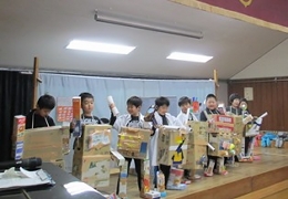 空き箱製作が大好きな子どもたちの力作「ロボット」を表現活動に活かしました。ほぼ等身大のロボットを身に付けて歩く様が、「ロボットになりきっていている!」という感じでした。