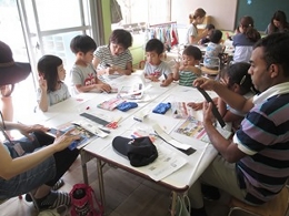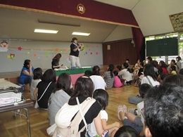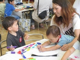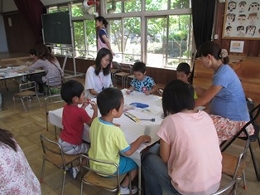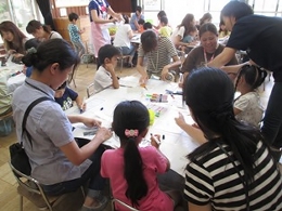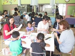 |   | ちょうちん作り 親子で夕涼み会に使うちょうちん作りをしました。ホールに集まり作り方の説明を聞いたあと、各部屋に分かれ製作開始。