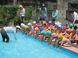小学校のプールをお借りして、今年のプール遊びがスタートしました。プールを貸していただく小学校の校長先生にご挨拶し、そして、プールの水と握手しました。また、みんなが水と仲良くなれるように、おまじないの水をまきました。