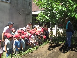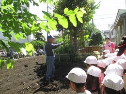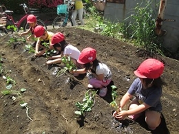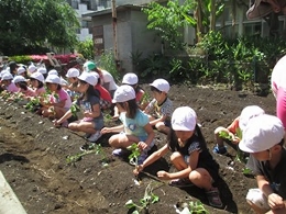 幼稚園の畑にサツマイモの苗を植えました。秋の収穫が楽しみですね!