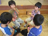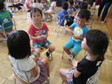 みんなでおやつもいただきました。らいおん組とうさぎ組は、いつも縦割りで活動するときのグループで輪になり、きっず組は親子で大きな円になり食べました。