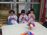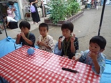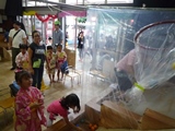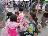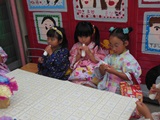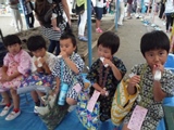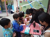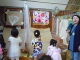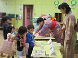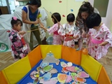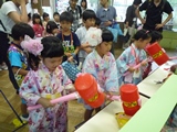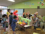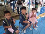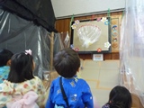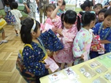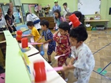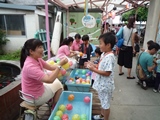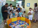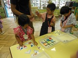 ひえひえやさん園児はグループで1枚 絵カードを持っていて、同じ絵カードを持っている「きらきらせいじん」を探し、絵カードを受け取ります。2枚揃えて「ひえひえやさん」に持っていくと、アイスと交換できるのです。「ひえひえやさん」の係のお母さんたちは、みんながアイスを交換できるのかどうか、ハラハラドキドキだったみたいですよ。