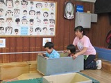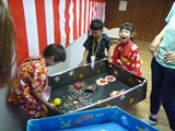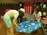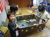 あんだー・ざ・しー うみのたからさがし海の底に探検にいき、さかなを釣って鍵をゲットできると、宝箱から宝を一つもられるのです。 ころころぼーるグループで箱を動かしながら、中の絵の穴にボールを埋めるゲームです。思うように穴のところでボールが止まってくれず、必死になっているところがとても可愛いのです!(大人も大興奮している人がいましたよ!) リトル・サンダー・マウンテン小さなジェットコースターです。見ている人にはそれほど速く見えませんが、乗っている人は結構スリルがあって面白いのです。 もぐらたたきもぐらを叩く方の真剣な顔と、駆け引きしながらもぐらを出し入れしている係のお母さん方の笑顔が、どちらも素敵でした! しゅっと しゅーと!