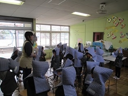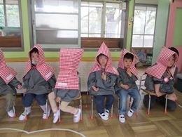防災頭巾を身に付ける練習もしました。初めてでしたが、みんな上手にかぶれました!