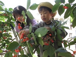 毎年小さな赤い実を付けるさくらんぼの木があります。でも、食べごろになると鳥が先に全部食べてしまっていました。しかし今年は、鳥たちに全部食べられることなく、子供たちにも味わわせることができました。この日はらいおん組が自分の手で収穫しました!!