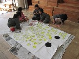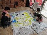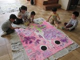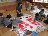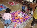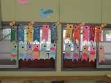 グループの名前を鯉のぼりの模様にしました。始めにクレパスで模様を描き、絵の具で隙間を塗りました。