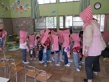 避難訓練をしました。らいおん組が外に避難する姿を見ました。その後保育室で防災頭巾をかぶる練習をしました。