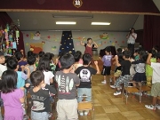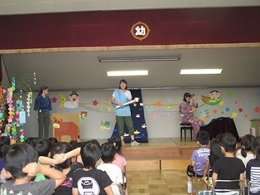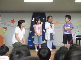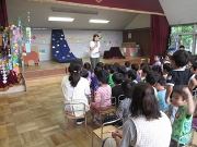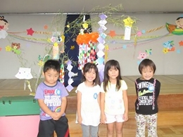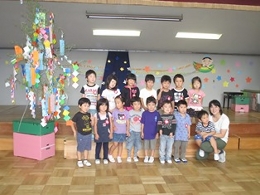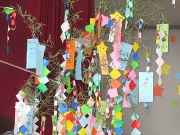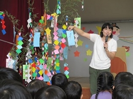 ホールにはそれぞれのクラスが作った笹飾りが飾られました。様々な折り紙で作った飾りがつけられていました。七夕の集いでは、「願い事を短冊に書くようになった由来」を知らせるのに「織姫と彦星」の劇をしました。