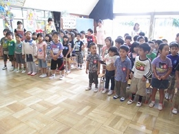 みんなで七夕飾りを見合いました。うさぎ組はクラスで一本の笹に飾りました。らいおん組はグループごとに一本笹が与えられ、それぞれのグループで飾りつけをしました。どんな飾りを作ったのかを、らいおん組のお友達が教えてくれました。