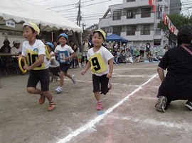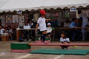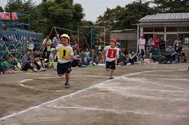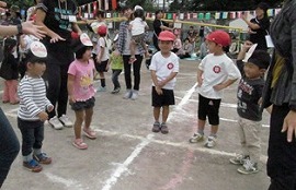 始めはうさぎ組、続いてらいおん組のかけっこ「よーい どん」。うさぎ組はゴールにいるらいおん組のお兄さんお姉さんを目指して走りました。らいおん組はゴールテープ目指して力強く走りました!