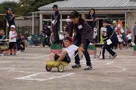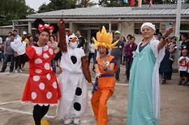 午後の保護者競技は「もうすぐハロウィンだ 行けー!」でした。二人三脚で届けた衣装を、モデルのお父さんお母さんが身につけていきました。なんと人気キャラクターに大変身!一体何に変身したのかわかりますか?