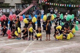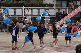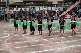 午前の最後はらいおん組のリズム「R・Y・U・S・E・I」。色鮮やかなポンポンのついたバトンを持って踊りました。長い曲で、たくさんの隊形変化がありました。バッチリ決まってかっこよかったですよ!