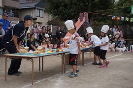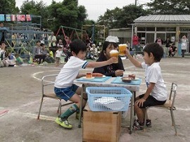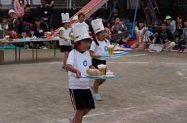 午後の一番は、うさぎ組らいおん組の合同競技でした。「高級そうなレストランにご来店!」は、うさぎ組とらいおん組がペアになり、互いの選んだメニューを、たくさんの料理の中から探し出し、無事料理が揃ったら「かんぱ~い!」