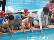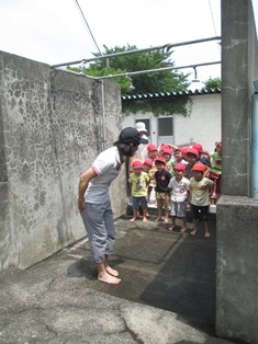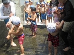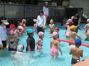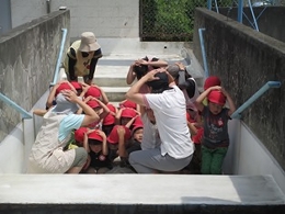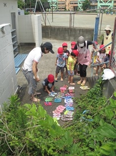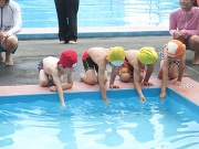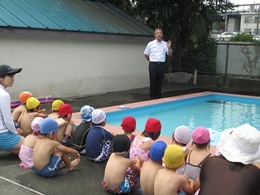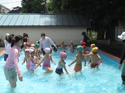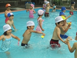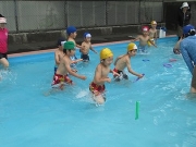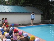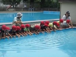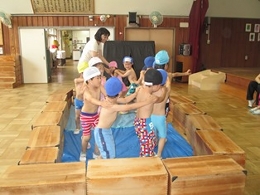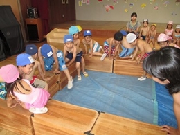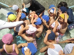 いよいよプール遊びの季節がやってきました。小学校のプールをお借りして遊びます。4歳うさぎ組の子どもたちにとって初めての学校のプールです。実際にプール遊びが始まる前に、場所を見に行ったり、水着に着替える練習とともに模擬プールで、プールごっこをしたりして本番に備えました。